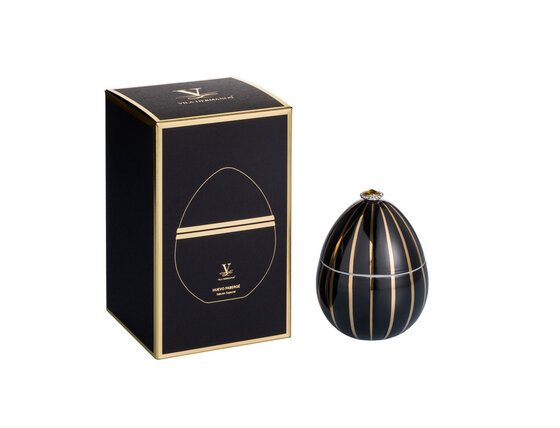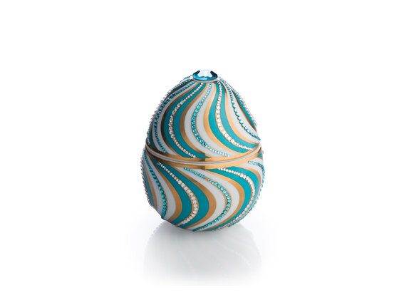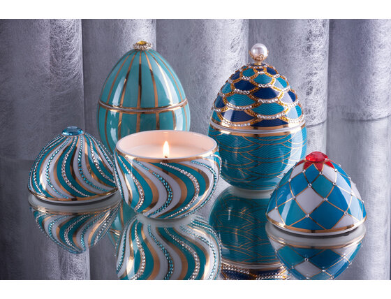 Razkošna dišeča sveča - turkizno jajce z zlatimi trakovi, ki ga navdihuje dizajn Fabergé. Narejeno iz keramike, ročno okrašeno z 18k zlatom, okrašeno z okrasnimi kamni. Majhen zaklad, ki razkrije razkošno parfumsko dišavo.