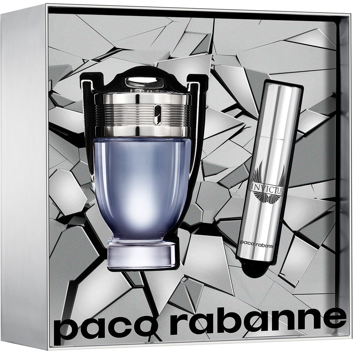 Invictus: Ime ponosno predstavlja moškost in latinsko identiteto. Ta človek je nepremagljiv, junak, ki mu vsi podležejo. V starih časih so športnikom pripisovali božanske lastnosti, danes so športniki simbol idealnega človeka in se počasi vračajo k mitološkim bitjem. Parfumi Paco Rabanne so uspešni zaradi pripovedovanja zgodb, zato vsaka dišava ustvarja svoj svet. Invictus se je rodil iz želje, da bi o športu spregovorili na nov način. Kakšen človek si ne bi sanjal, da bi nekega dne vstopil na stadion ali areno in slišal svoje ime z vseh strani in postal predmet poželenja? Polbog Invictus je moderni junak. Ta čutna sveža kompozicija se zelo razlikuje od tradicionalnih moških dišav. Ni niti občutljiv poletni vonj niti tradicionalna kolonjska voda. Invictus je strukturirana dišava s prav posebno osnovo. Tradicionalna struktura piramide je bila opredeljena v samo dve skupini sestavin. Sveže tone predstavljajo toni grenivke, lovorjevega lista in morja. Čutni del parfuma je sestavljen iz lesa gvajaka, sive jantarje in pačulija.