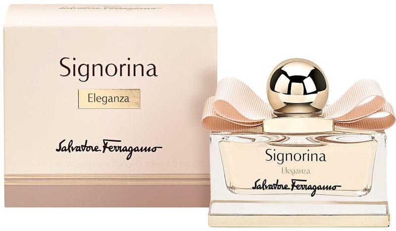 Eleganca je sestavni del kreacij Salvatoreja Ferragama. Posamezne kreacije, ki jih odlikujeta šarm in prefinjenost, nosijo brezhiben okus, zaradi katerega je blagovna znamka Firence zaslovela po vsem svetu. V čast tej prefinjenosti Salvatore Ferragamo omenja dišavo Signorina Eleganza, razkošno dišavo kot praznovanje ženskega šarma in zapeljivosti. Prepoznavni sveži toni grenivke in hruške predstavljajo živahno in spodbudno spoznavanje vonja. Mandljev prah in zlati kosmiči osmantusa tvorijo nežno, a intenzivno srce, ki ga odlikuje užitek, ki prinaša razkošje. Pačuli in bela koža v osnovi prineseta na kožo učinek sladkega, trajnega vonja.