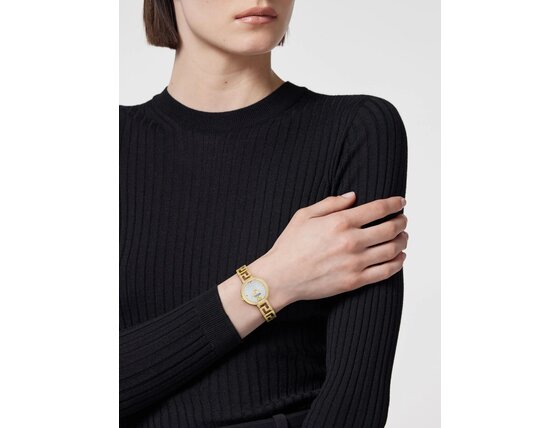Ženska ura Versace VE7A00524 Ladies Watch Greca Goddess Diamonds 28mm 3ATM ti doda eleganco in podpre tvoj stil. S kakovostno obdelavo iz delavnice znamke Versace ti ni treba skrbeti, da stopiš zraven.