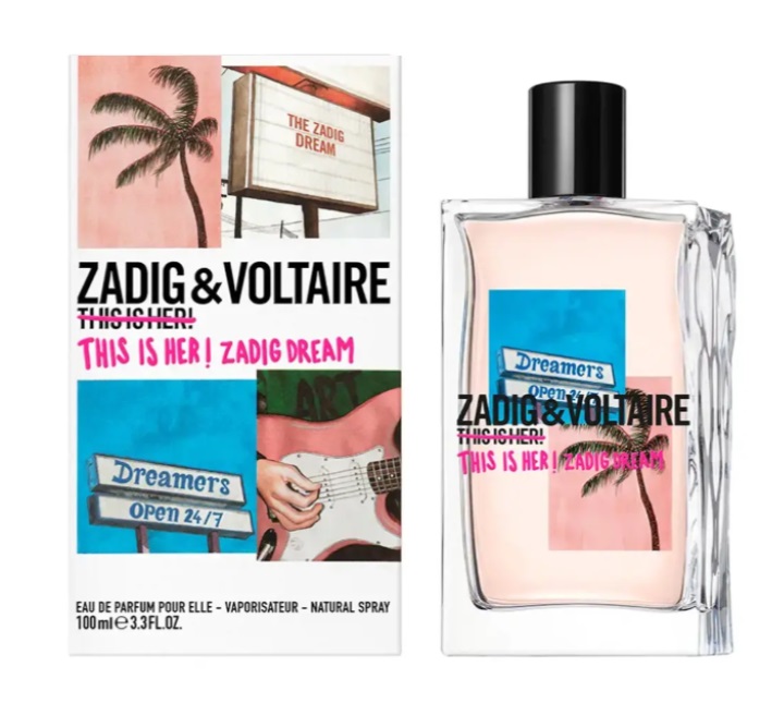 To je ona! Zadig Dream znamke Zadig&Voltaire pomeni ustvarjalno energijo in veselje do življenja. Dišavo s sadnimi in svežimi notami je razvila Sidonie Lancesseur in se ponaša s celo paleto zapeljivih sestavin: v uvodu se pojavita pikantna grenivka in čutna breskev. Šmarnica in jasmin v kombinaciji z odtenki kostanja ustvarijo vznemirljivo celoto. Zasvojljiv podpis izžareva občutek svobode in lahkotnosti zahvaljujoč mošusu in benzoinu. Ta parfumska voda je obvezna oprema za sanjače in ustvarjalne misli!